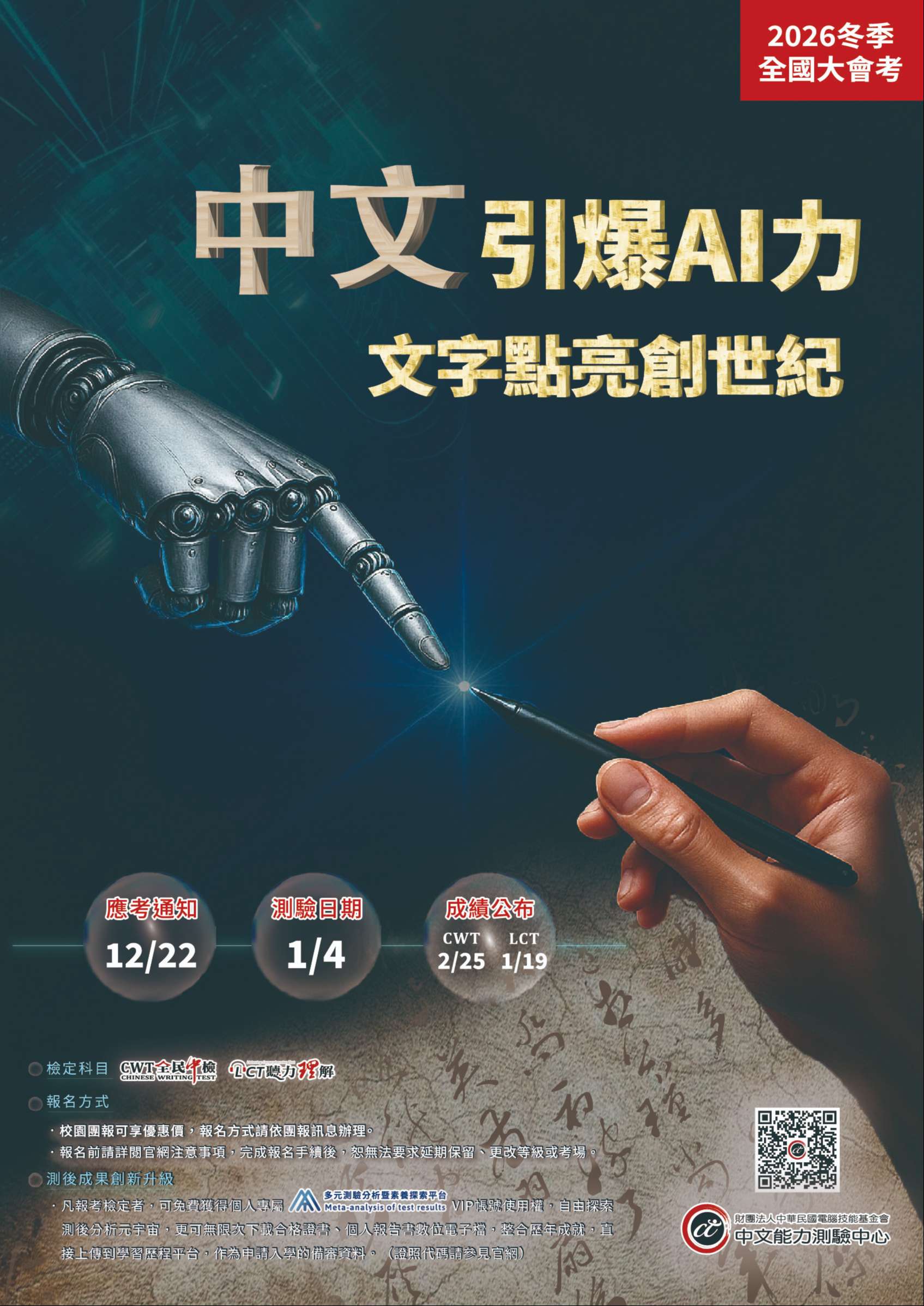 主旨: | 財團法人中華民國電腦技能基金會「2026中文能力測驗中心冬季全國大會考」將於2026年1月4日舉辦。 |
