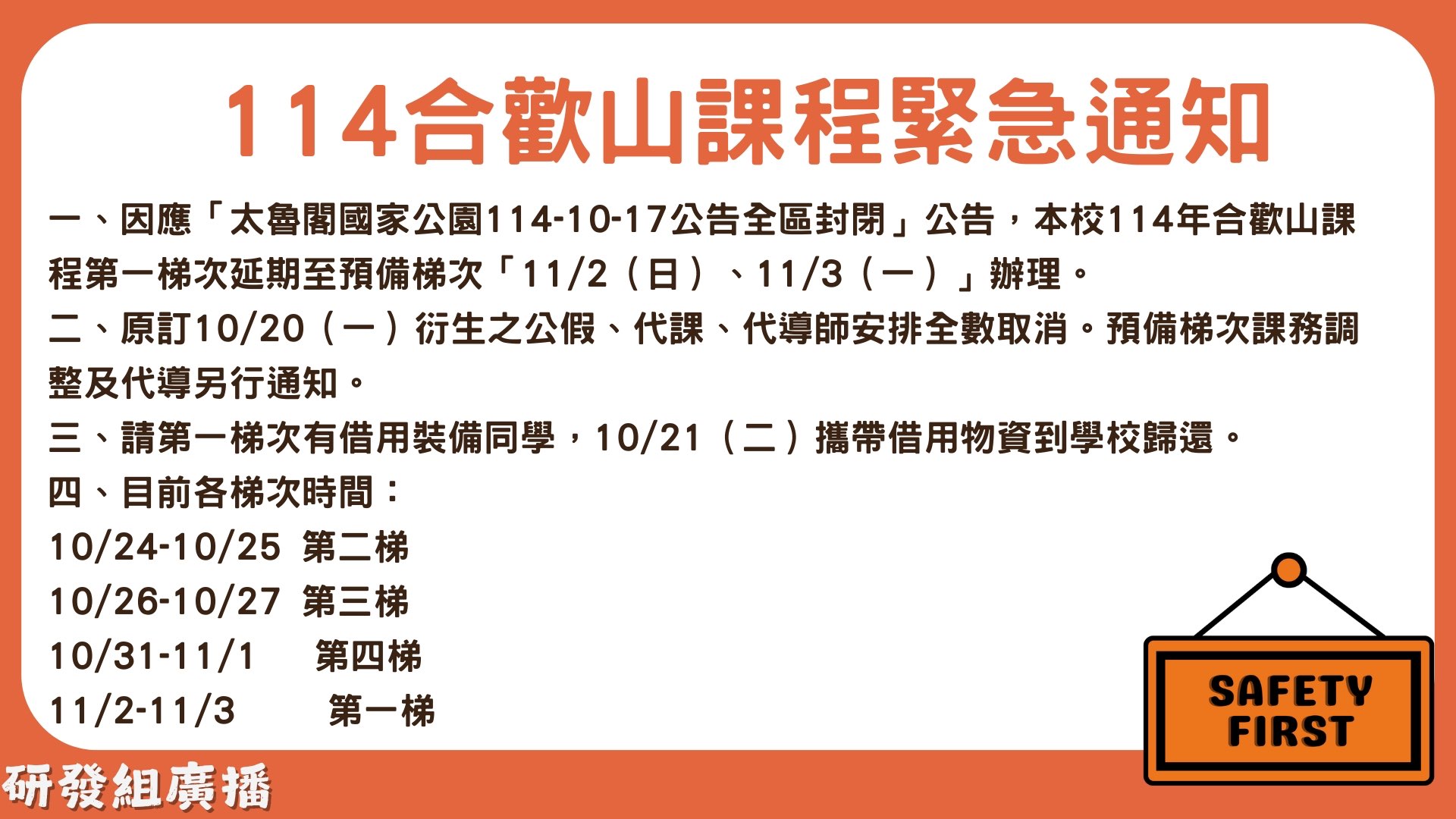 一、因應「太魯閣國家公園114-10-17公告全區封閉」公告(如附件)本校114年合歡山課程第一梯次延期至預備梯次「11/2(日)、11/3(一)」辦理。