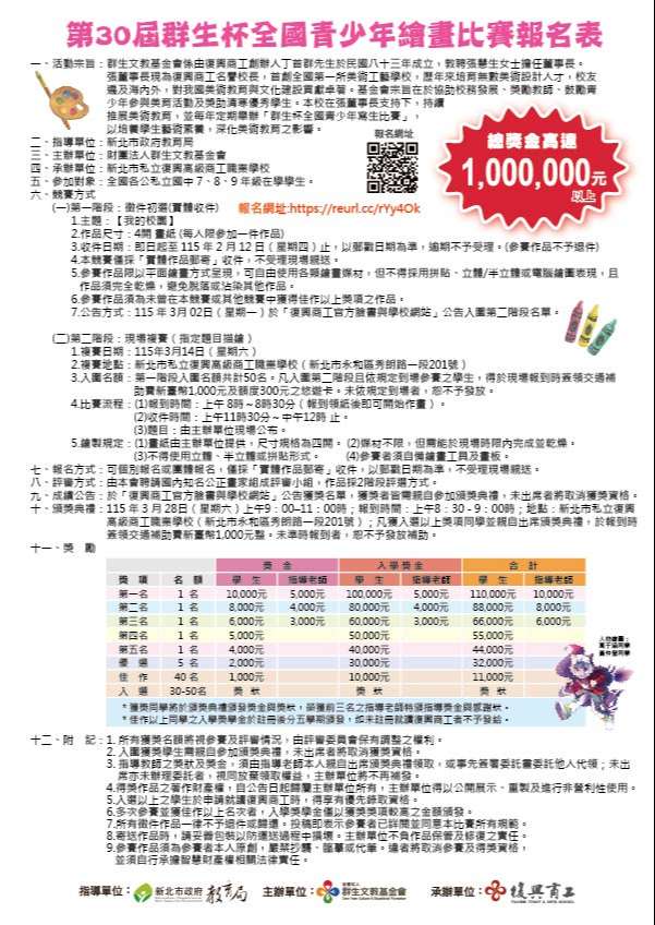 一、比賽方式及時間:(詳細資訊請見簡章說明)【第一階段】實體收件 115年 2月 12日 (星期四) 前,郵戳為準【第二階段】現場複賽 115年 3月 14日 (星期六) 8時至12時;地點:復興商工