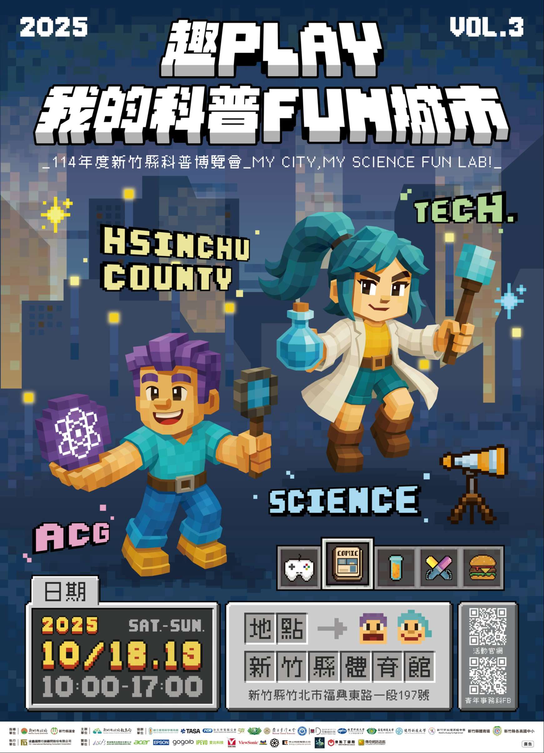 (三)內容:館內設置近百個科學體驗、先進科技互動及ACG展攤闖關,完成指定任務即可兌換限量紀念品、限量消費券及抽獎券,每日提供機票等多項豐富好禮抽獎。舞台邀請知名偶像團體、二次元人氣偶像及親子劇團演出,館外提供動漫/文創週邊及美食市集。