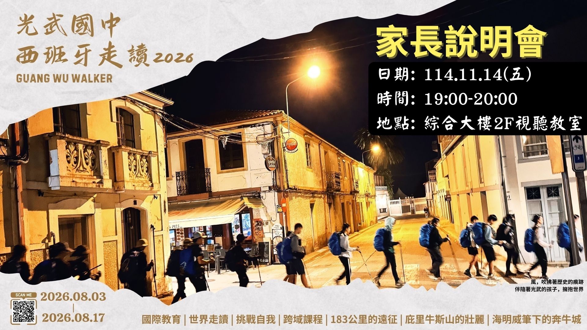 2026光武國中西班牙走讀課程【家長說明會】日期:114.11.14(五) 19:00-20:00地點:光武國中2F視聽教室