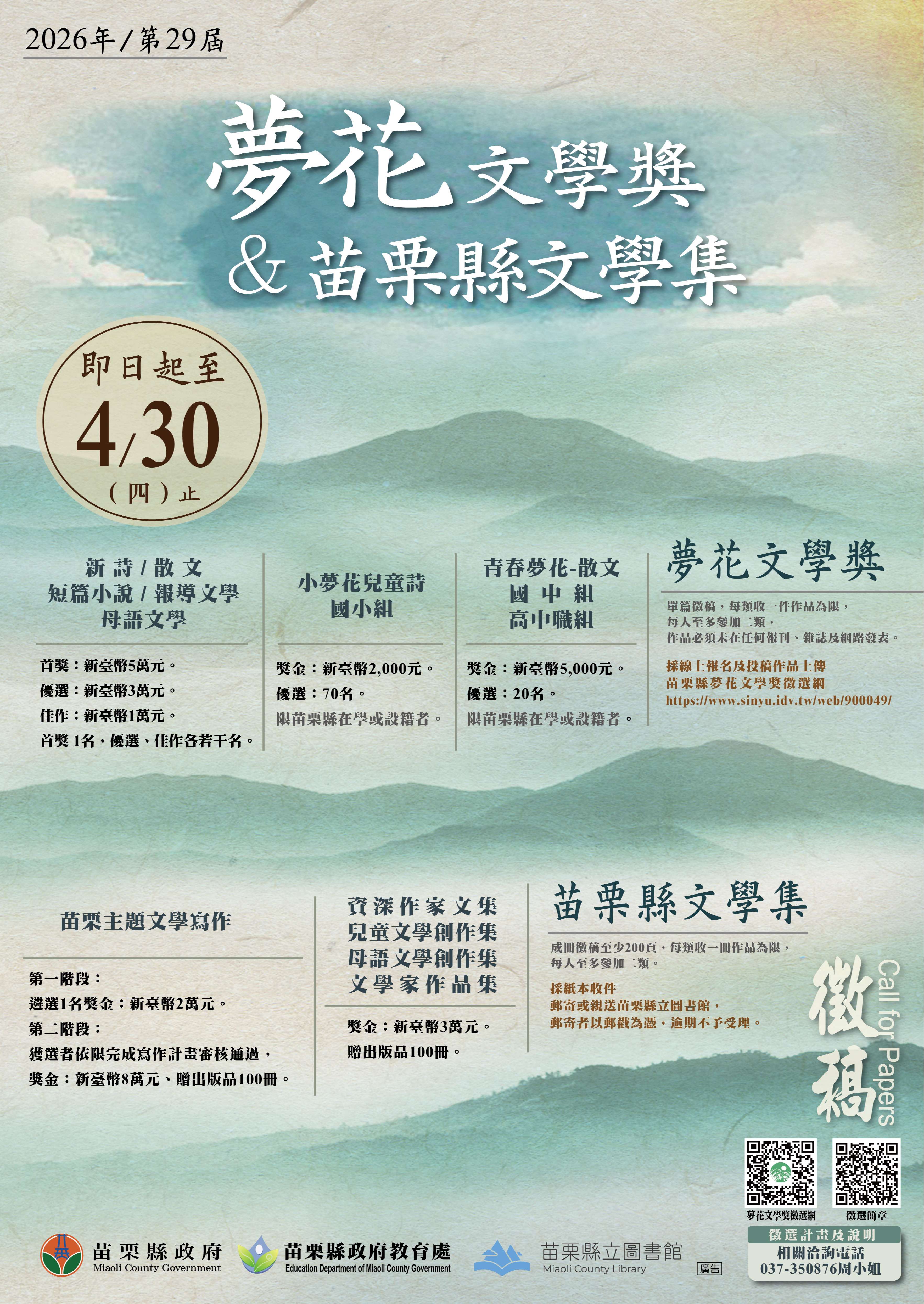 | 二、 | 為鼓勵文學創作,保存地方文學並傳承文史,本府賡續辦理2026年「苗栗縣第29屆夢花文學獎暨苗栗縣文學集」徵選,徵選項目如下: |